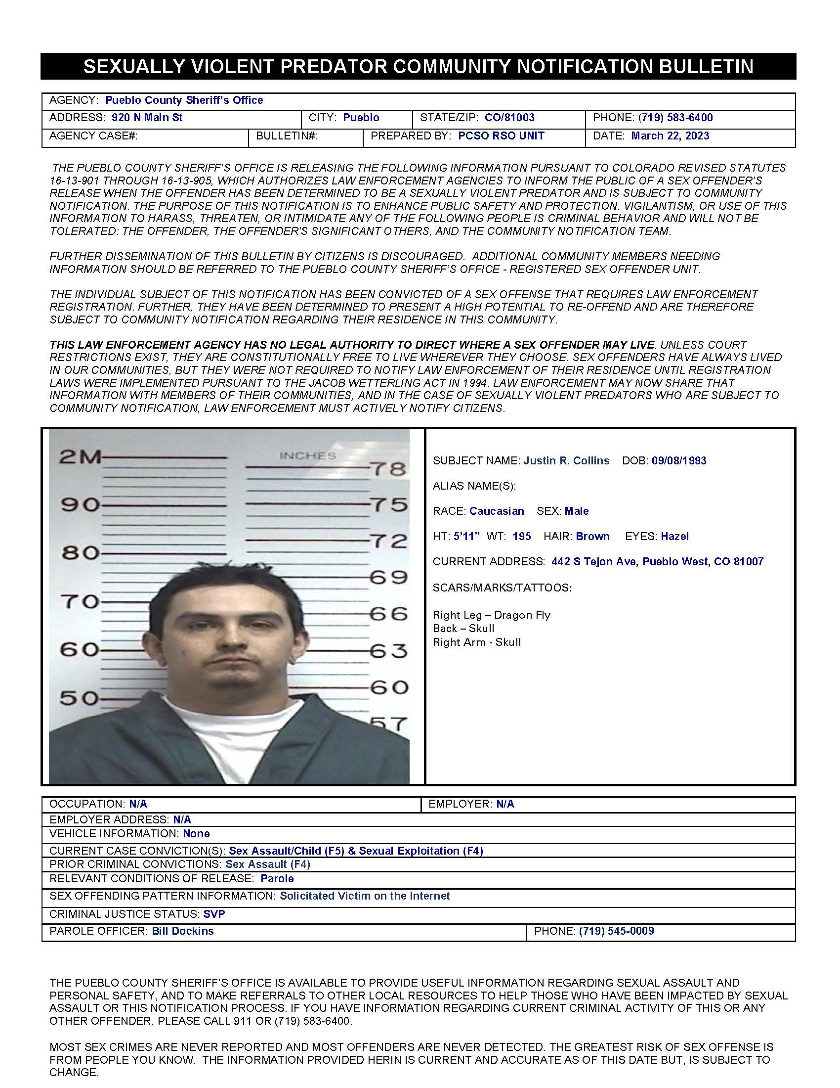 Justin R Collins - SVP Justin R. Collins - March 22, 2023 - Resides at 442 S. Tejon Ave, Pueblo West, CO 81007